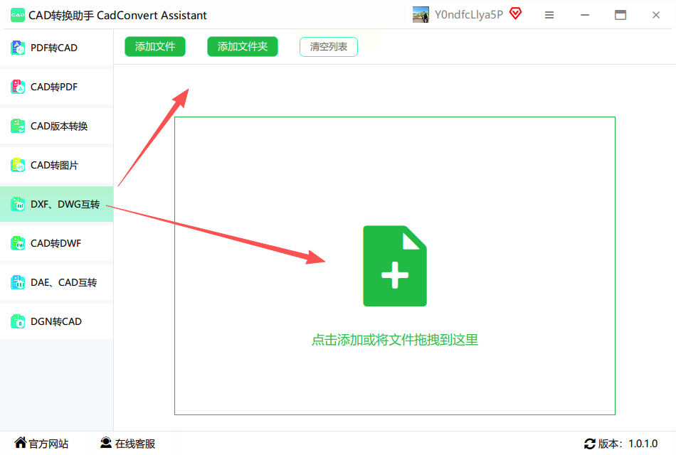 2. 上传文件:界面左侧会显示文件管理区域,右侧则是上传区域。你可以直接拖拽DXF文件到指定位置,也能点击“添加文件”按钮逐个选择。支持同时上传多个文件,适合批量处理的需求,批量完成dxf转换成cad更高效。