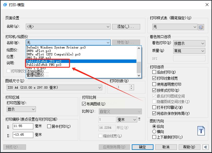 2. 按快捷键「Ctrl+P」调出打印窗口,在“打印机/绘图仪”里选「PublishtToWeb JPG.pc3」(JPG格式)或「PublishtToWeb PNG.pc3」(PNG格式)