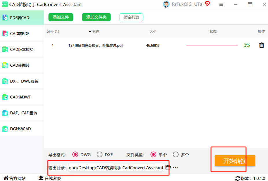 * 输出目录:点击“浏览”按钮,为转换后的CAD文件指定一个存放位置。建议新建一个专门的文件夹,避免和原始文件混在一起,方便后续查找。