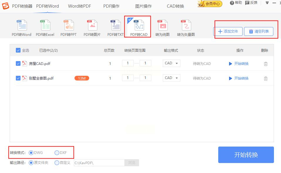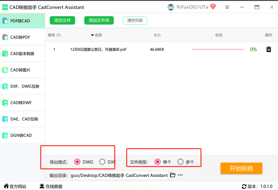 * 输出格式:在下拉菜单中选择你需要的DWG或DXF格式。