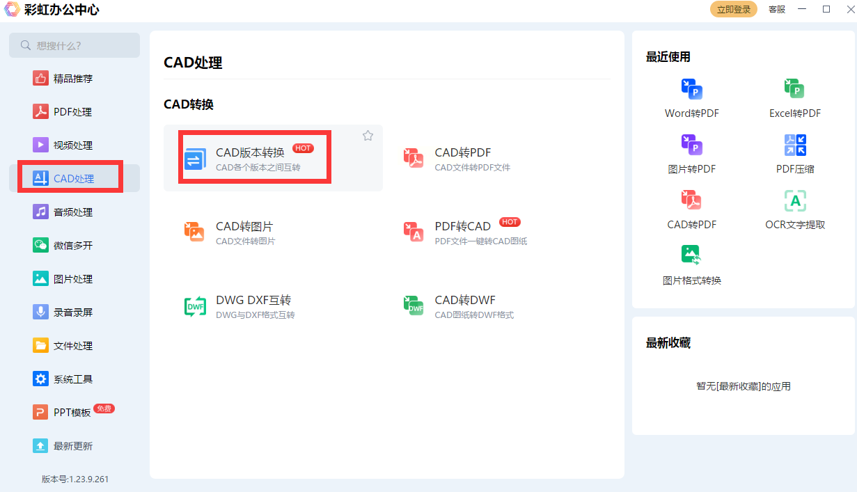 适用场景:电脑里装了彩虹办公中心的,顺手用它做cad 转换高版本,不用额外下载软件