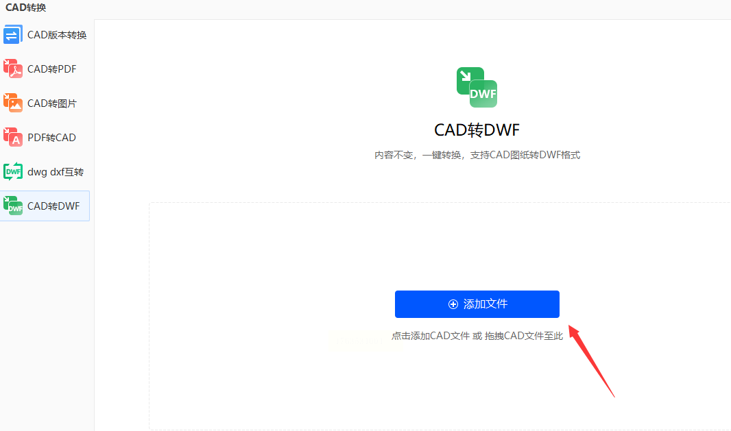 进入转换界面后,左侧选择“CAD转DWF”功能,右侧点击“上传文件”按钮。支持批量导入多个CAD文件(如DWG、DXF等格式),也可直接将文件拖拽至上传区域,方便处理多个图纸。