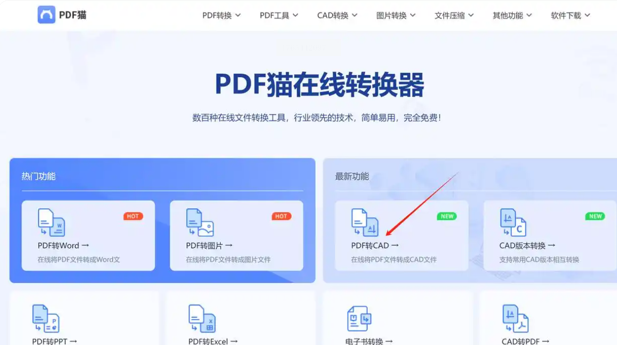 - 在首页选择"PDF工具"分类下的"PDF转CAD",进入专用转换页面