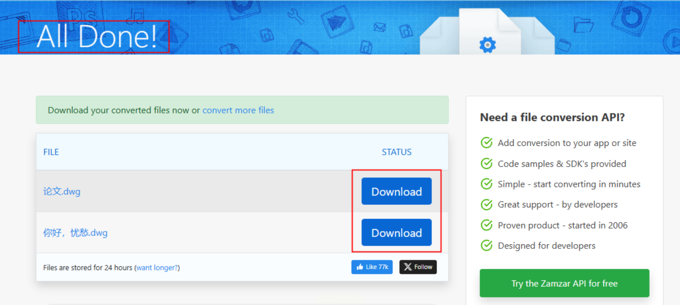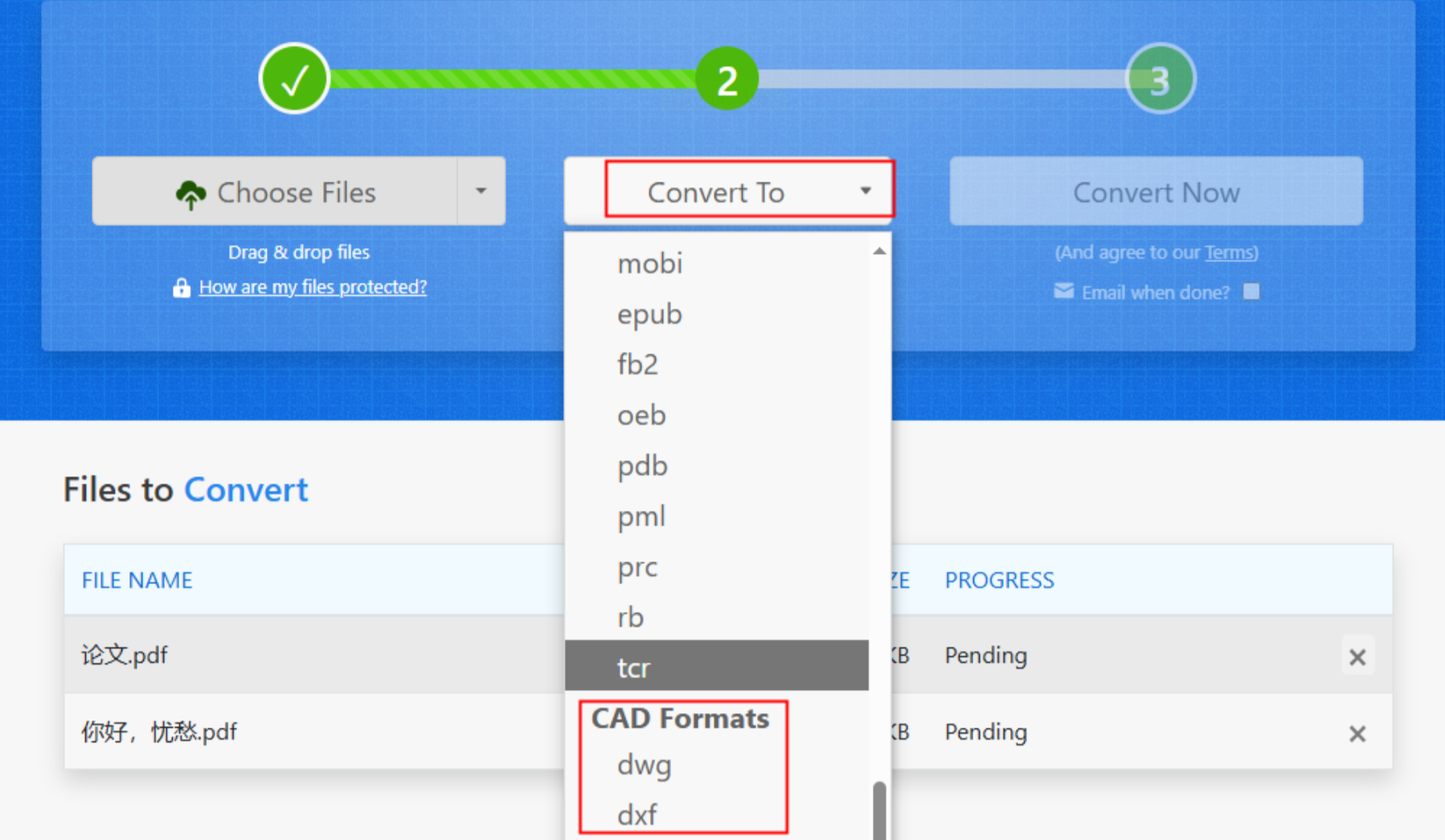 打开Zamzar在线转换,该平台支持300+格式互转,CAD转换支持AutoCAD 2000-2023版本。