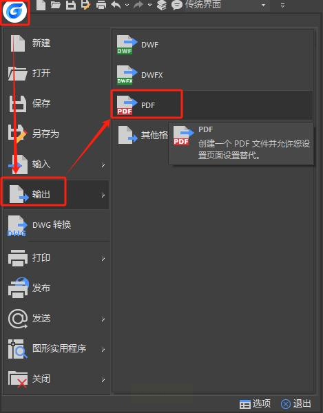2. 点击导出菜单:左上角有个“G”形状的logo(浩辰CAD的图标),点一下,弹出下拉菜单,选【输出】→【PDF】。