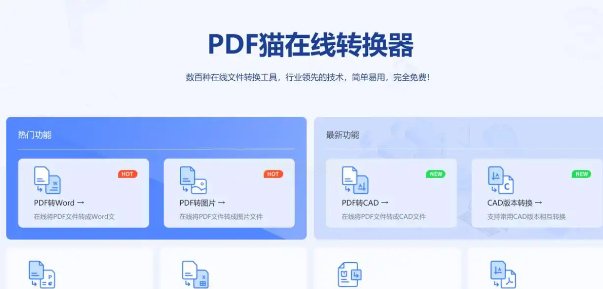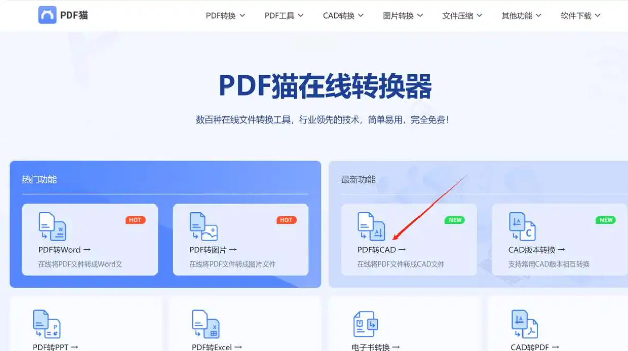 1. 打开页面:在浏览器输入“PDF猫”在线地址,点击首页的“PDF转CAD”
