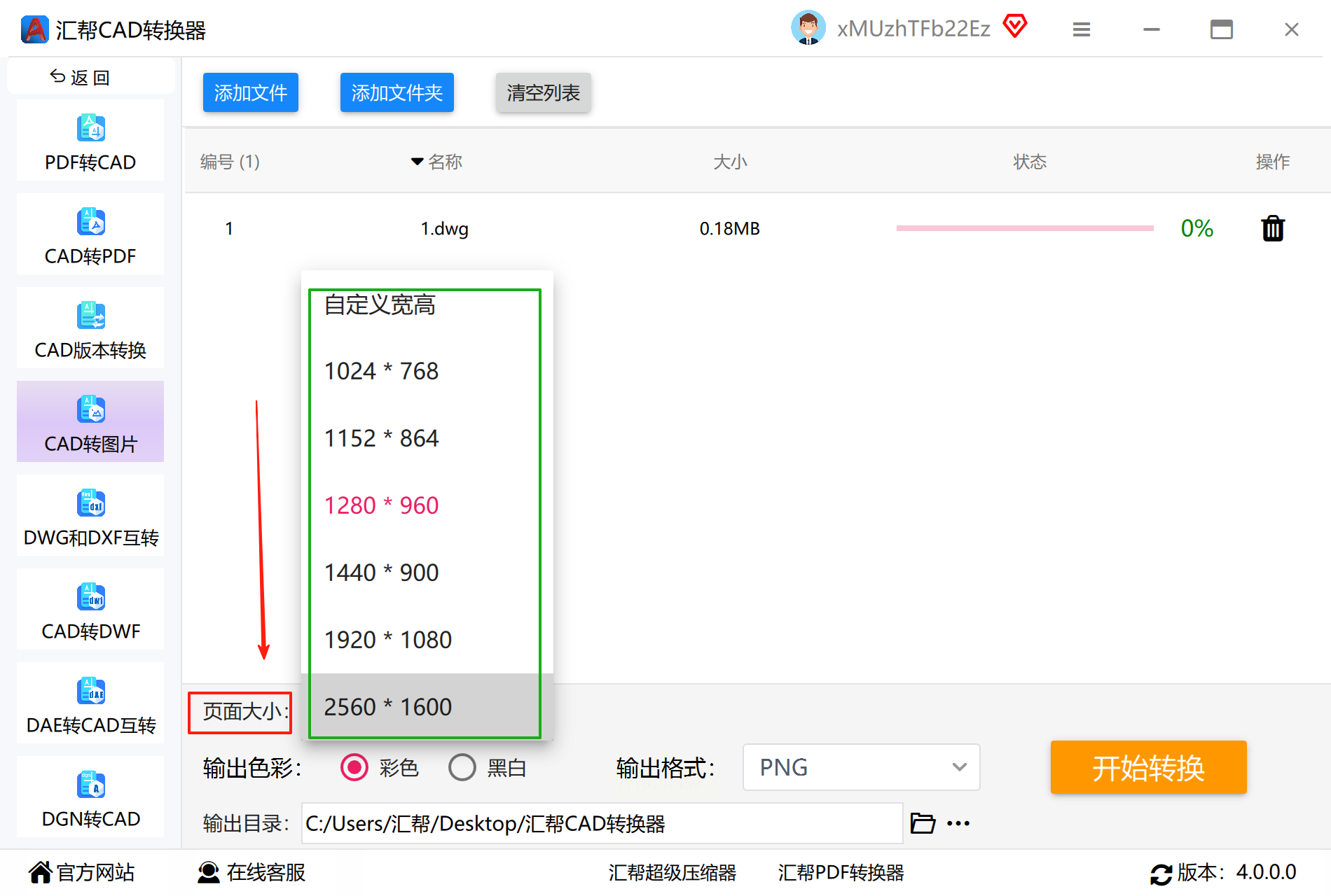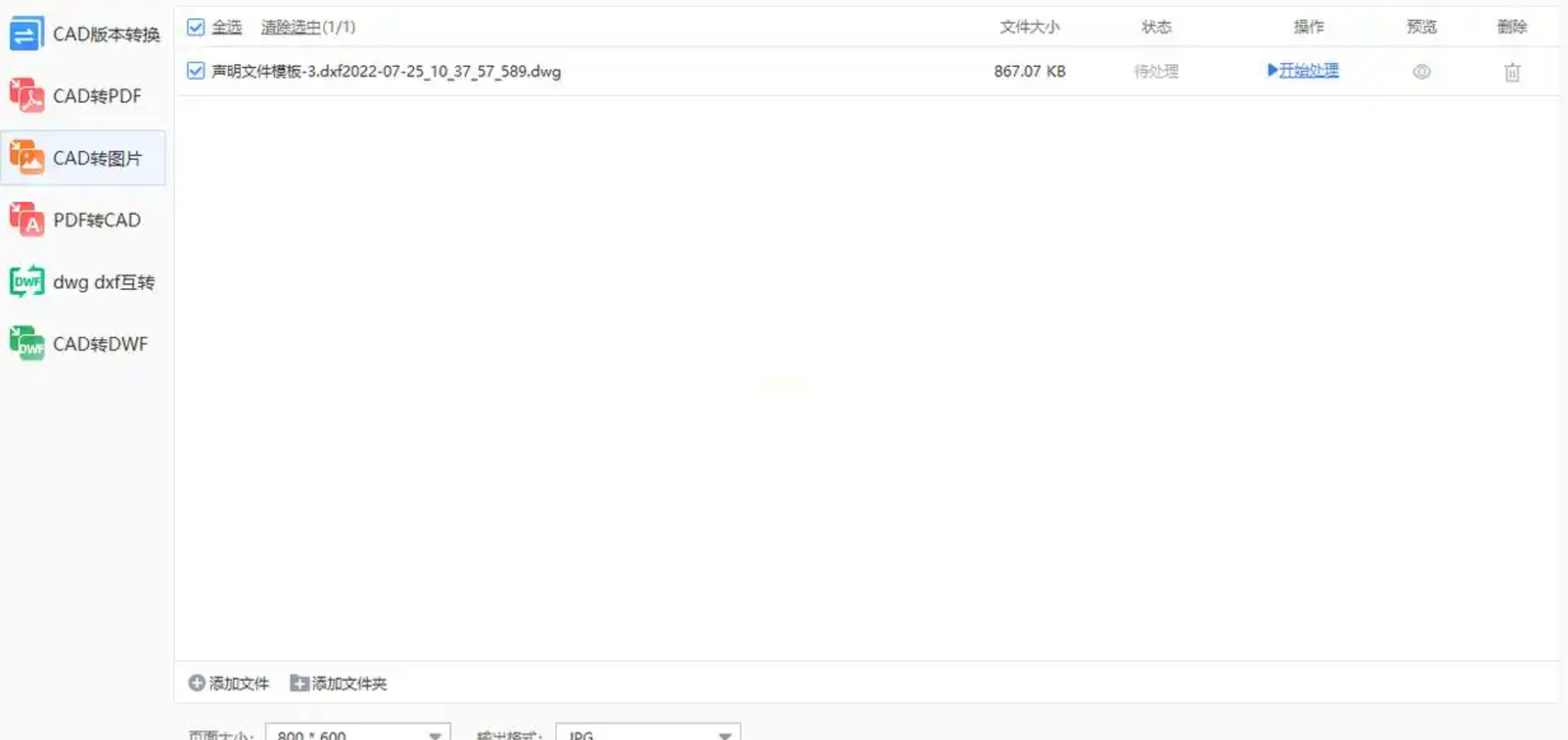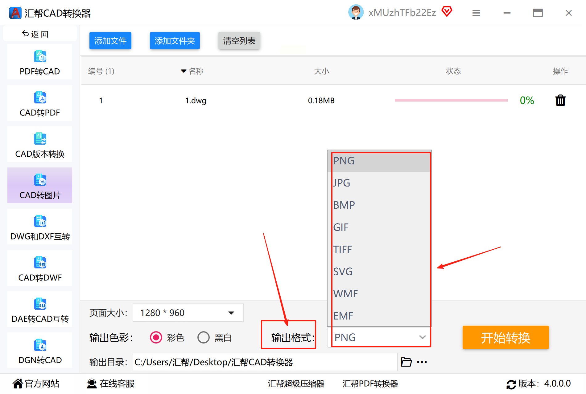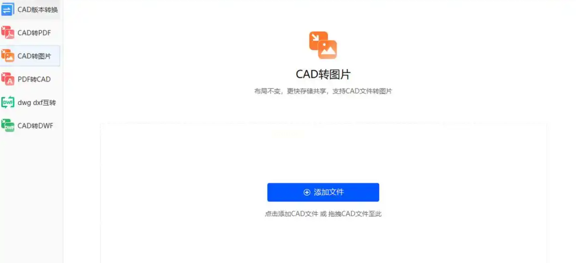 2. 点击"CAD转图片"功能,上传文件后选择输出格式;