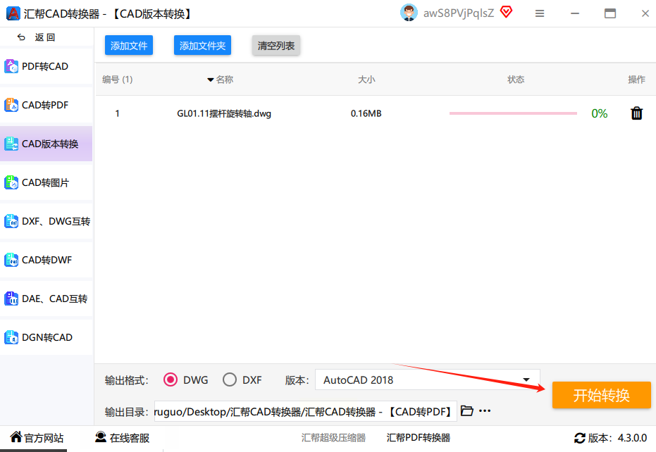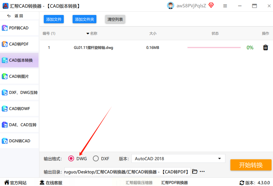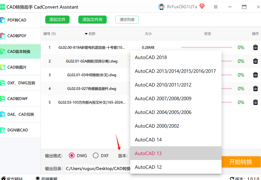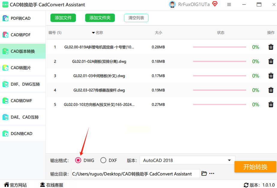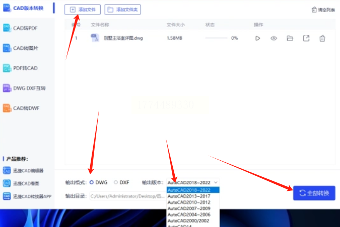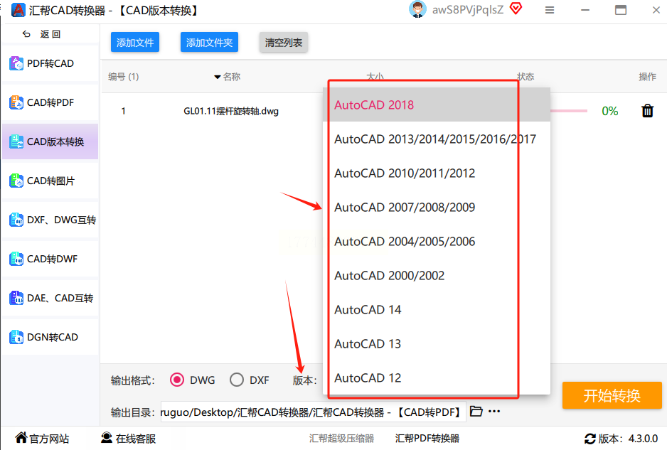 - 格式选择:默认是dwg格式,保持原格式转换即可。如果需要dxf格式,在下拉菜单中选择对应的格式类型。