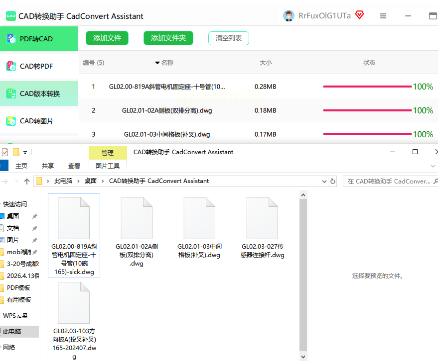 2. 文件导入:点击"添加文件夹"按钮,选择包含CAD文件的整个文件夹。软件会自动扫描所有dwg、dxf格式文件,可在列表中勾选需要转换的文件。