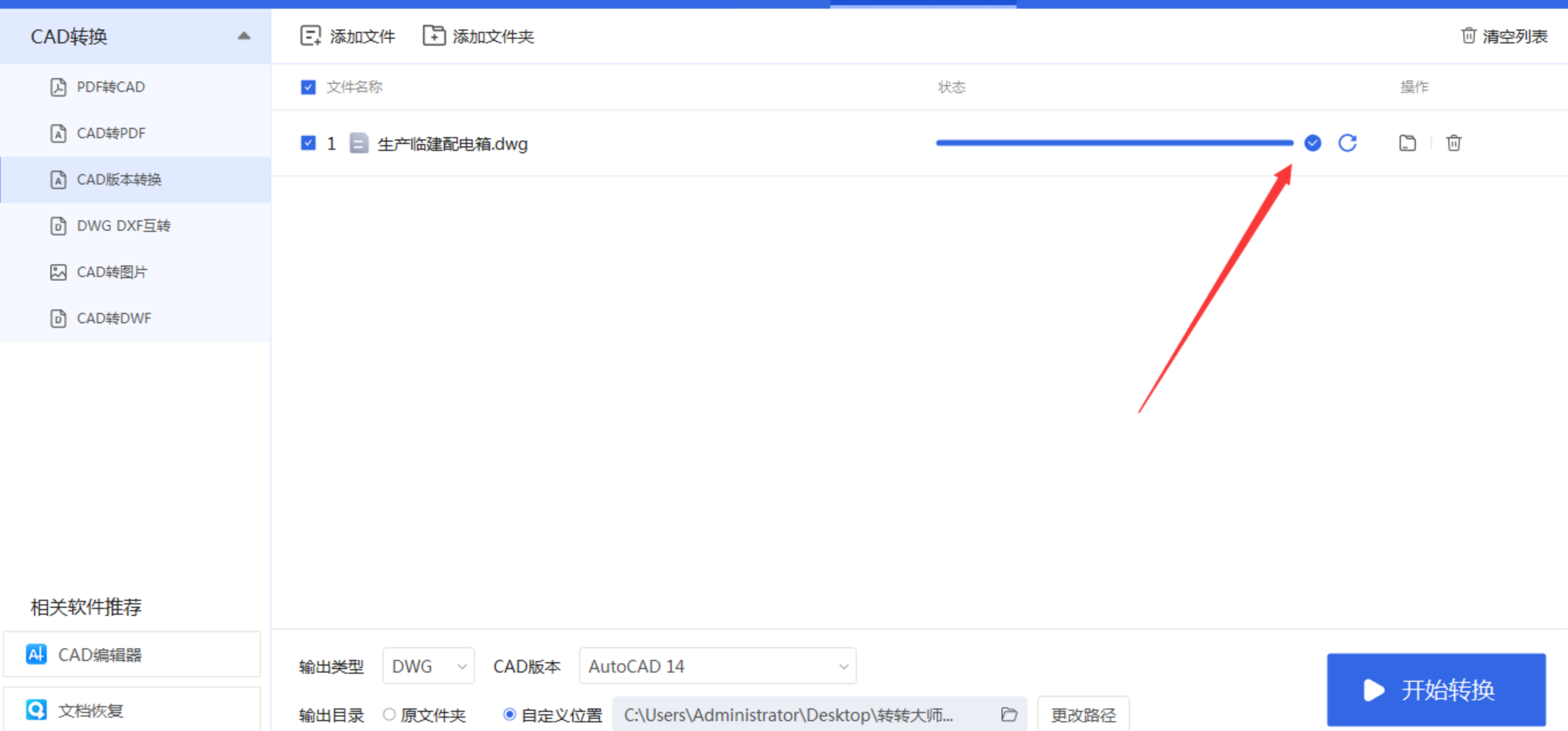 都设置好后,深吸一口气,点击那个醒目的“开始转换”按钮!然后你可以稍微放松一下,喝口水,软件会自动处理。转换完成后,它会贴心地自动打开存放结果的文件夹,转换好的图纸已经安静地躺在那里等你了!