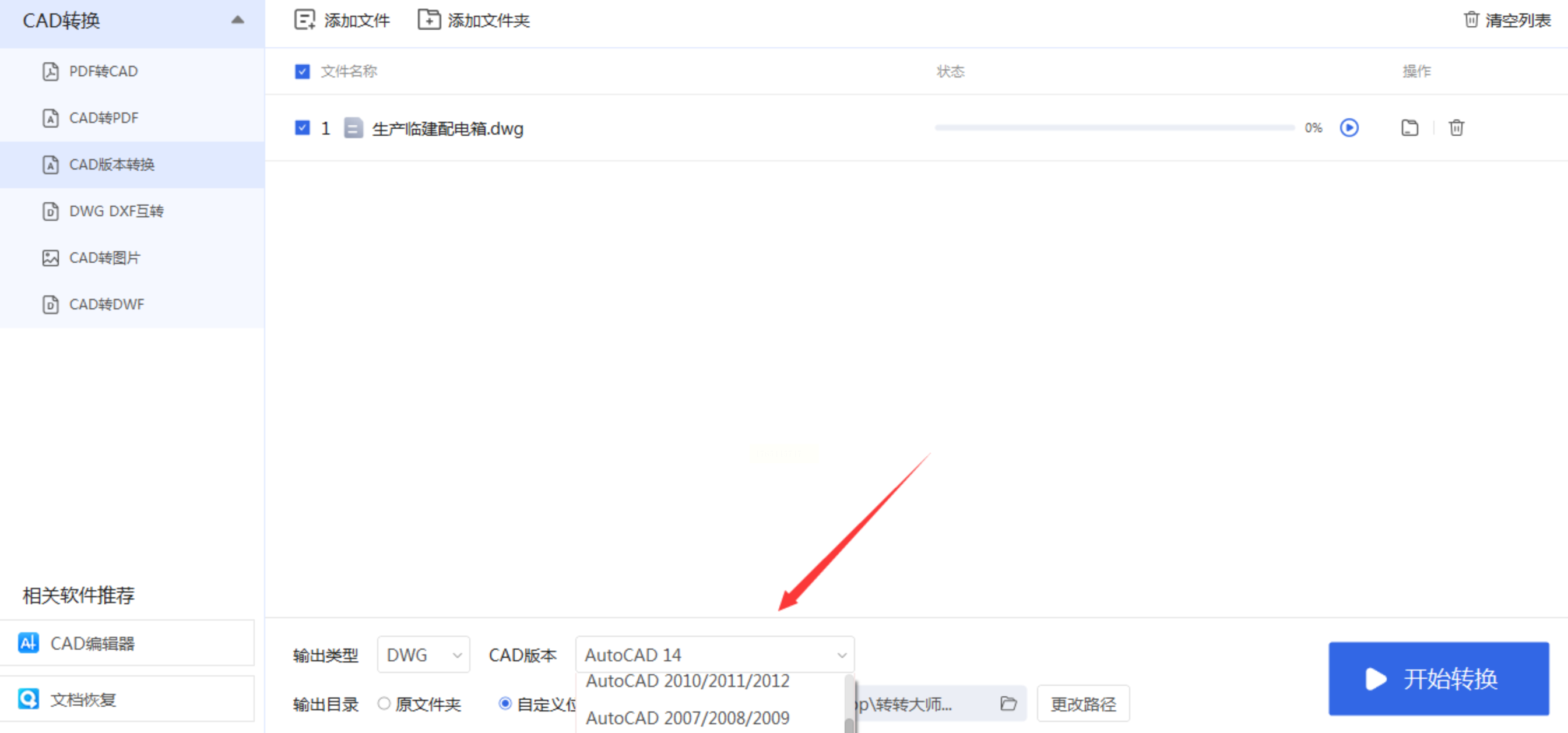 在软件下方,你会看到“输出格式”选项。这里一般保持和原文件一样的格式就行(通常是DWG)。当然,如果你想顺便把格式也换了,比如从DWG转成DXF,这里也可以改。