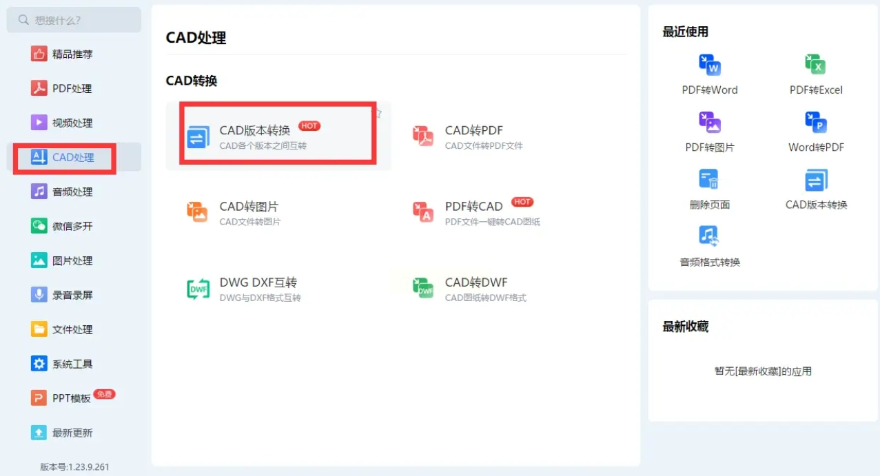 打开软件后,左侧有一排功能分类,找到“CAD处理”这一项。点开后,会展开更多CAD相关功能,其中就有咱们要的“CAD版本转换”。点它!