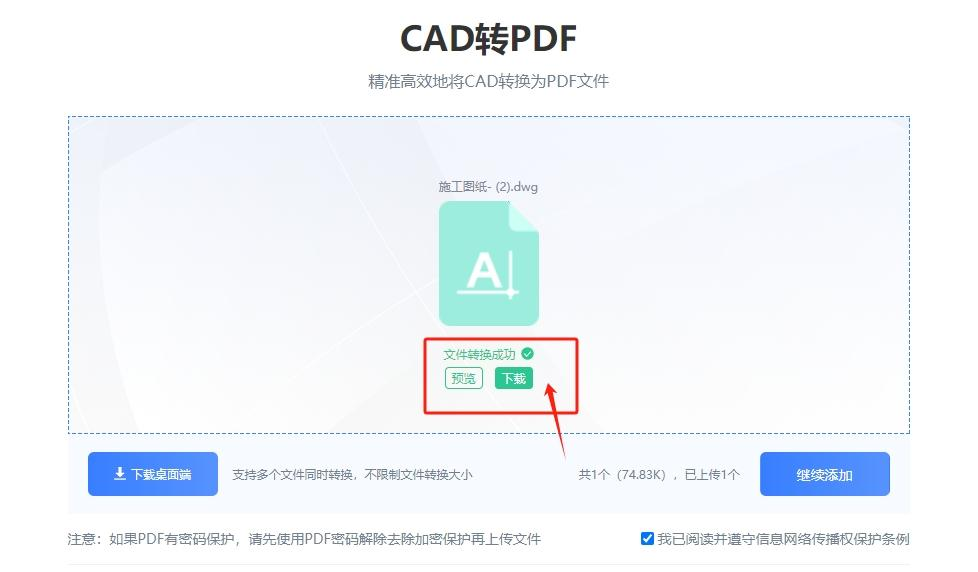优势:转换时自动去除CAD原文件的冗余图层,生成的PDF更简洁,适合图纸标注和注释后的二次加工。