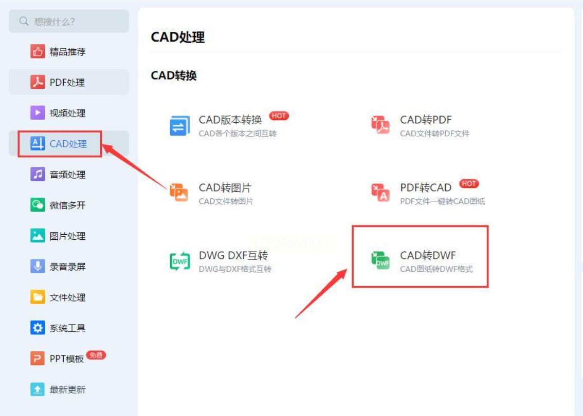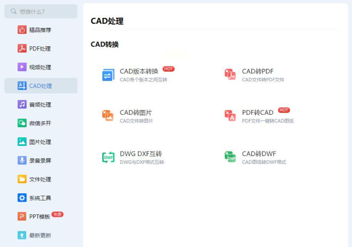 点击软件快捷方式启动程序,在左侧导航栏中找到“CAD处理”分类。这里不仅包含CAD转DWF功能,还能处理CAD图纸的版本兼容、批量打印等其他需求,适合构建完整的图纸处理工作流。