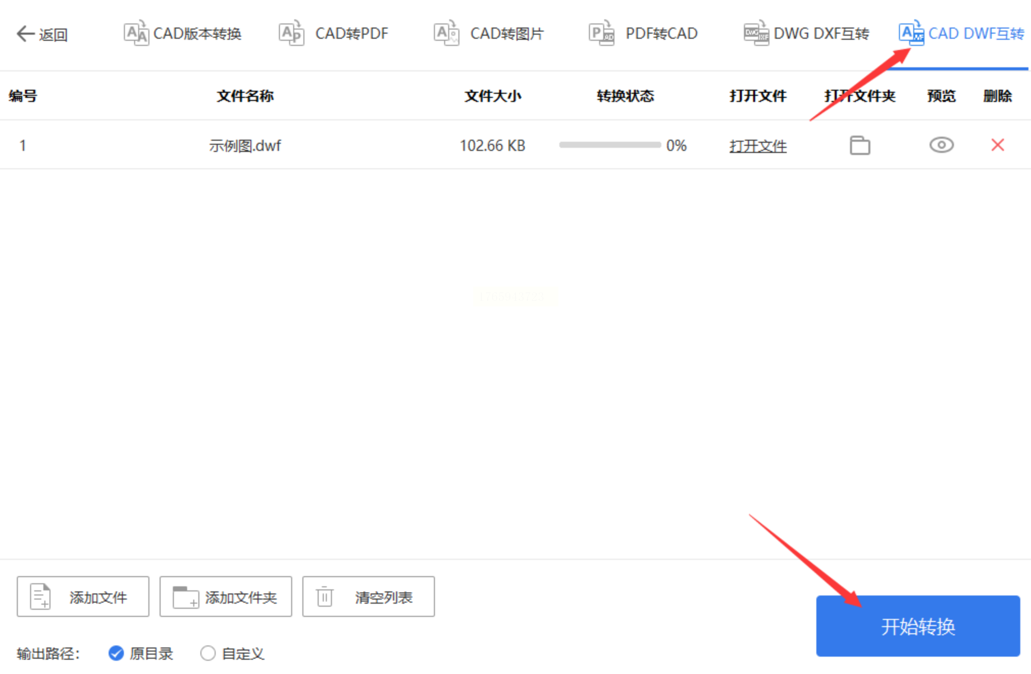 2. 功能区选择:在主界面上方导航栏点击“批量转换”,左侧选择“DWF→DWG”转换模块
