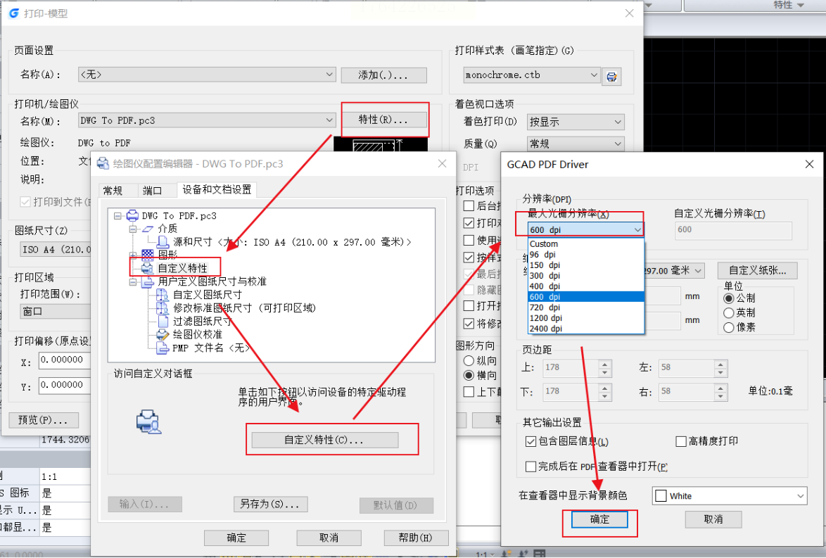 2. 按下快捷键【Ctrl+P】调出打印设置窗口,在“打印机/绘图仪”下拉菜单中选择“DWG to PDF.pc3”。