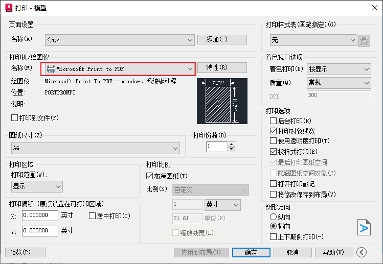 3. 在打印设置里,打印机/绘图仪选“DWG to PDF.pc3”(系统自带的虚拟打印机)