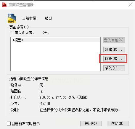 - 打开CAD软件,点击“文件”菜单→“页面设置管理器”→“修改”