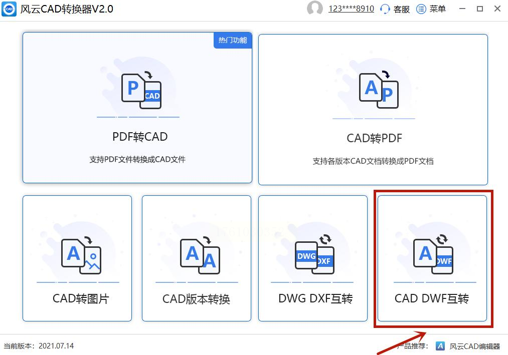步骤一:启动软件,在主界面选择“DWF CAD互转”功能。