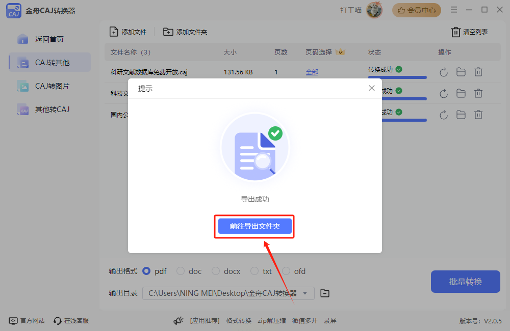 步骤四:点击“批量转换”按钮,静静等待片刻。转换成功后,软件一般会有提示,你可以直接点击“打开输出文件夹”快速查看转换好的PDF文档。