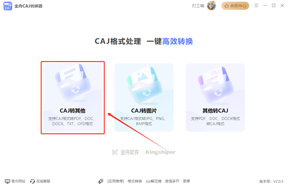 步骤一:打开金舟CAJ转换器,在主功能菜单中选择“CAJ转其他”这个选项。