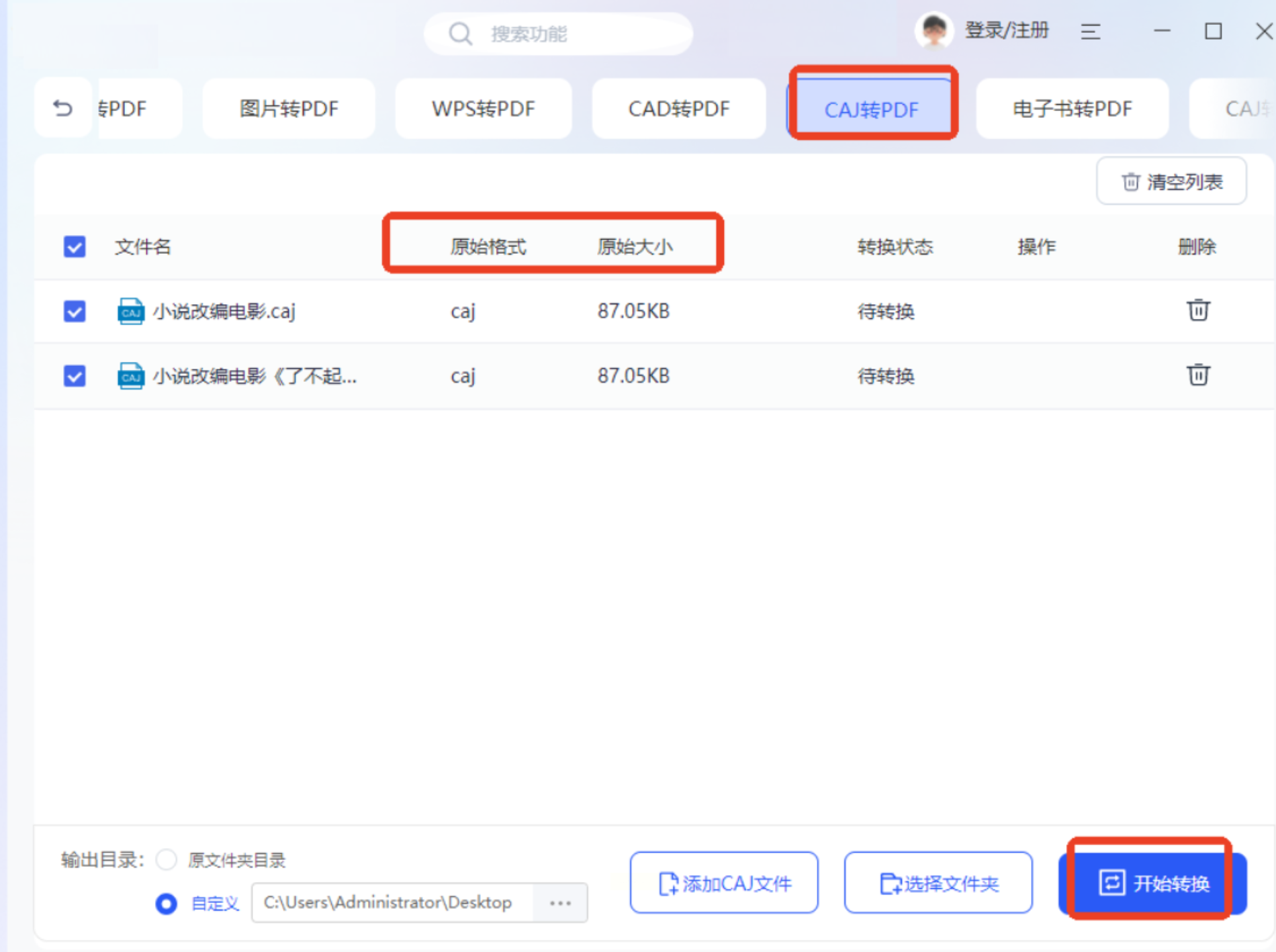 点击「添加文件」按钮,支持多选CAJ文件,界面会显示文件名、原始大小、页数等元数据,方便核对文件。