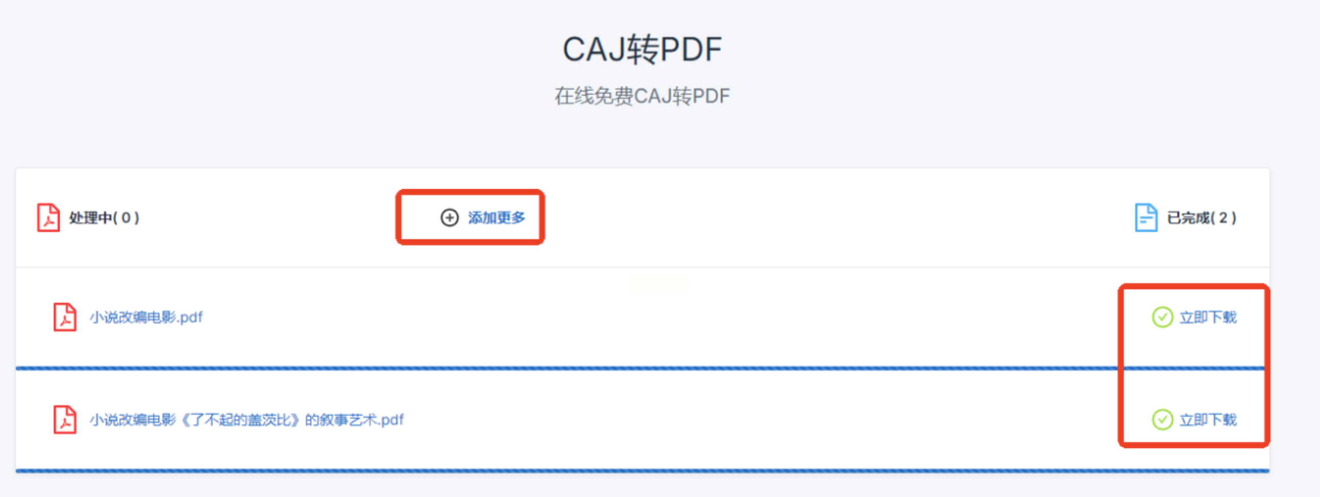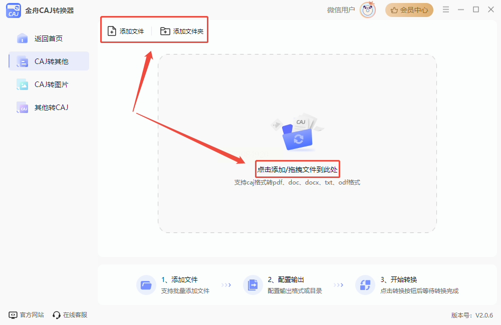 - 单个/少量文件:点击界面中央「添加文件」按钮,在弹窗中选择目标CAJ文档