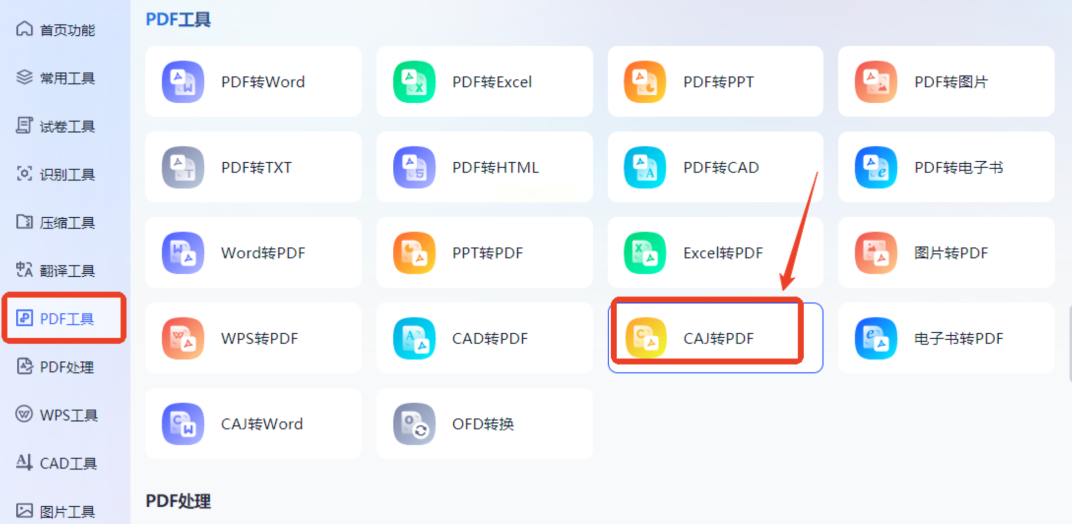 打开软件后,在左侧功能菜单中找到「PDF工具」分类,点击进入后即可看到「CAJ转PDF」选项。