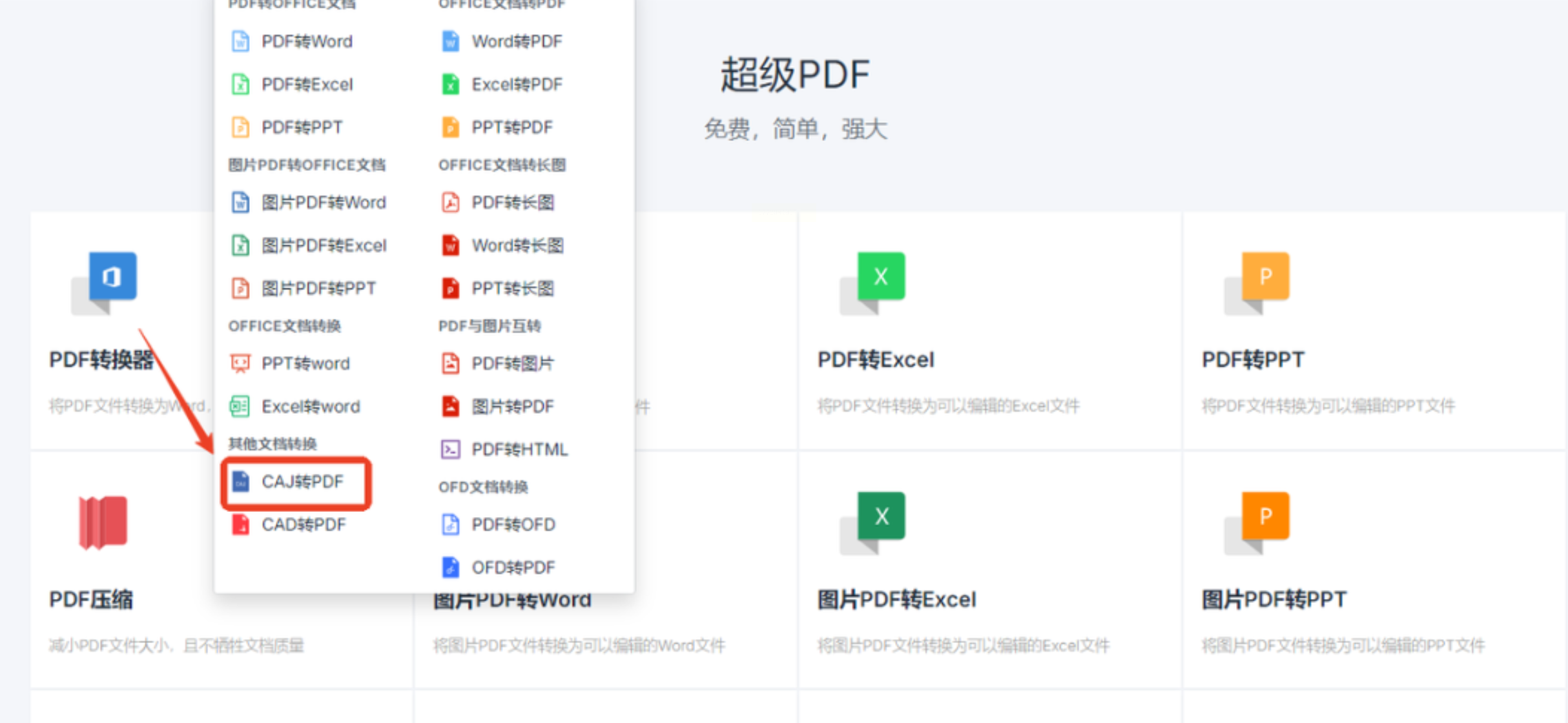 打开浏览器访问超级PDF官网(无需注册账号),在首页点击「文档转换」→「CAJ转PDF」,无需下载客户端,直接在线操作。