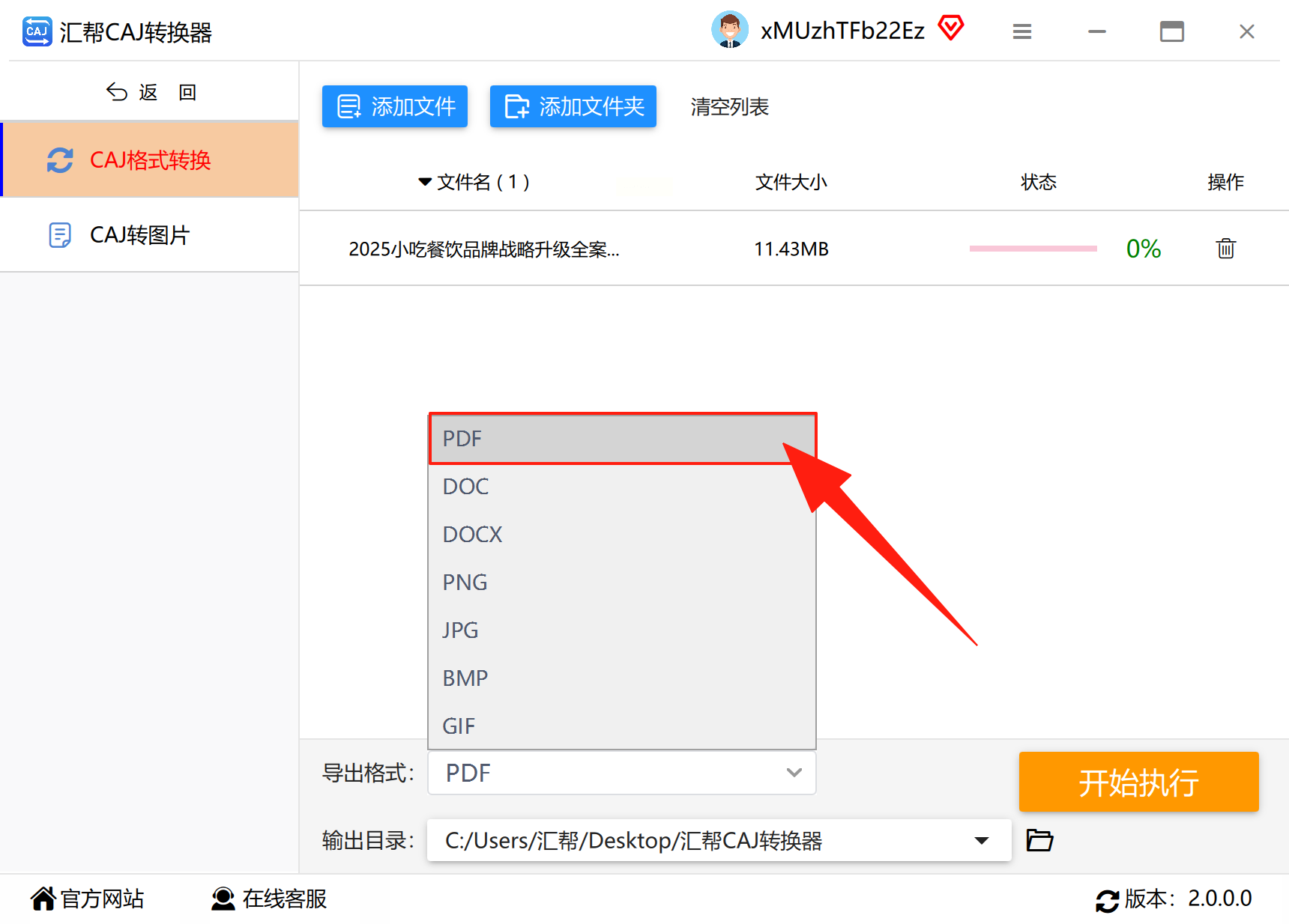 - 格式选择:在右侧输出格式列表中勾选「PDF」(默认保留原文档排版,也可选择图片嵌入模式)