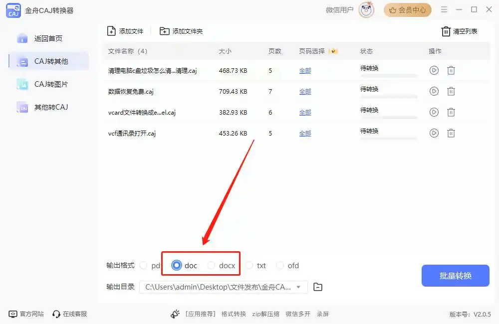 步骤三:在输出格式下拉菜单中,明确选择你需要的Word文档格式。