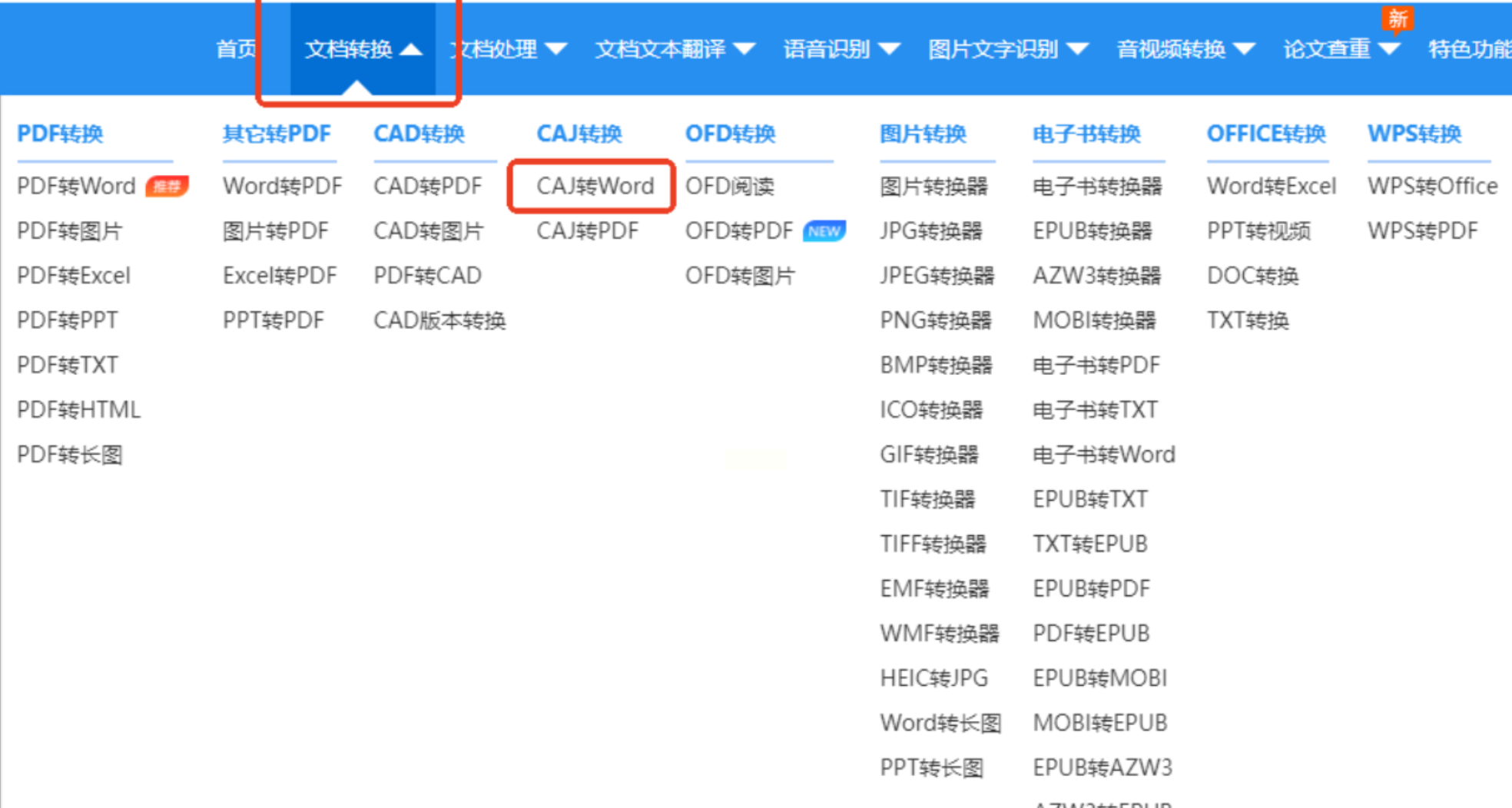 打开在线转换网站(注意甄别正规平台,避免钓鱼链接),在首页功能区找到【文档格式转换】→【CAJ转Word】分类。