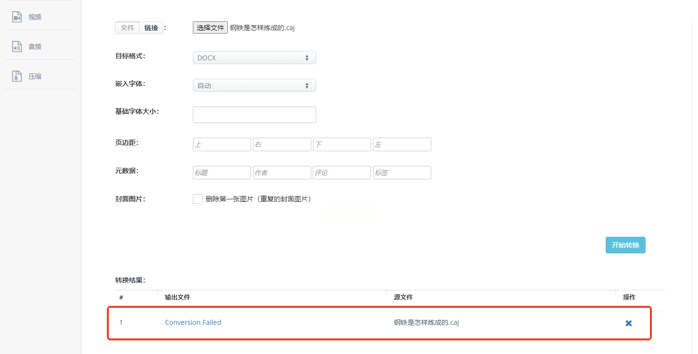2. 上传CAJ文件后,选择输出格式(推荐“docx”),点击“智能转换”。