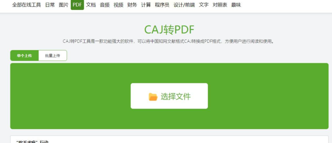 在网站的功能列表中,找到“文档转换”或“格式转换”大类,然后在其中选择“CAJ转PDF”这个具体的工具。点击进入该工具的专用页面。