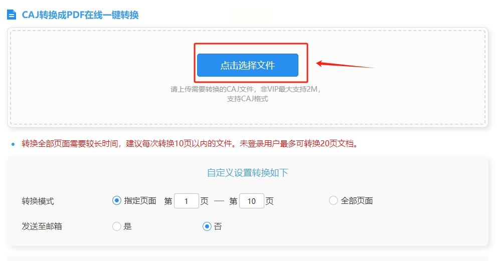 - 点击“选择文件”,从本地导入CAJ文件(单次最大50MB)。