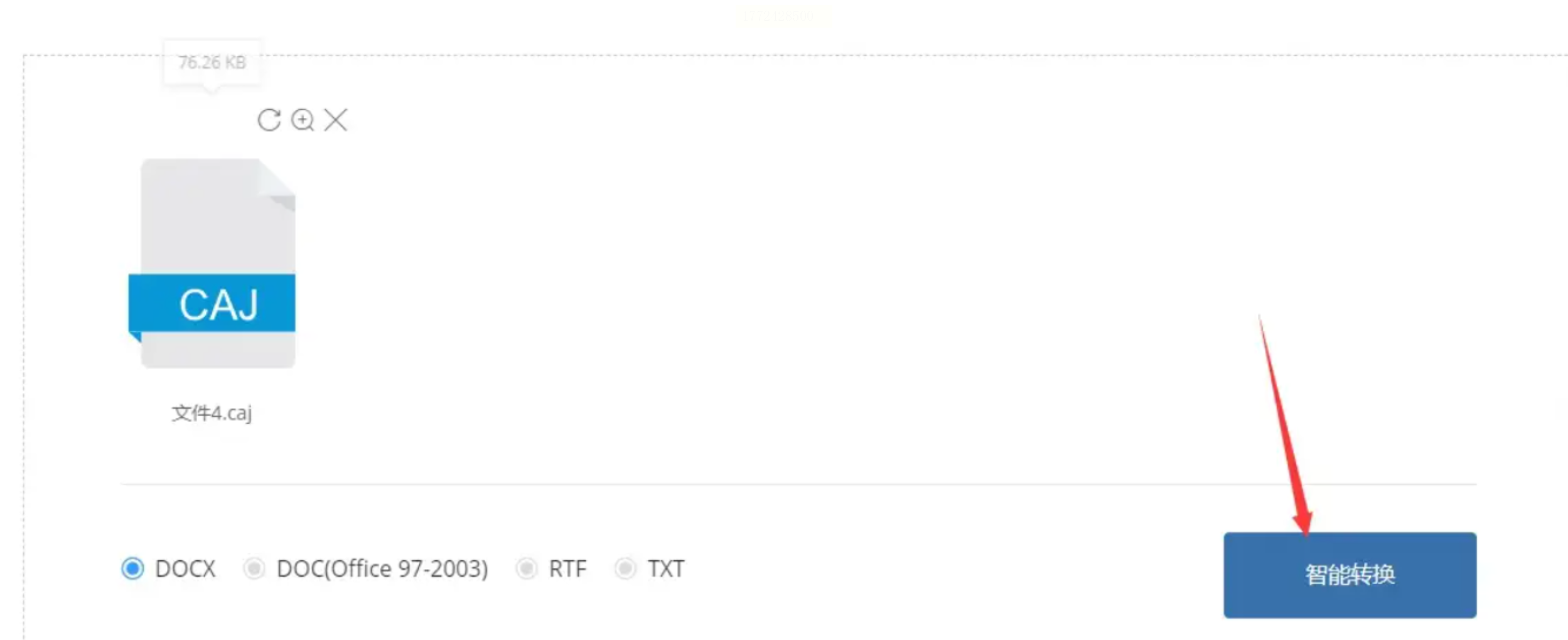 Step3:系统默认输出格式为“docx”,点击“智能转换”按钮(无需设置路径,自动保存在浏览器下载目录)。