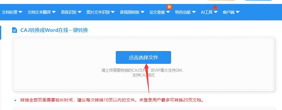 2. 点击页面上那个蓝色的“点击选择文件”按钮,会弹出一个文件选择窗口。找到你要转换的CAJ文件,注意文件大小不能超过2M。