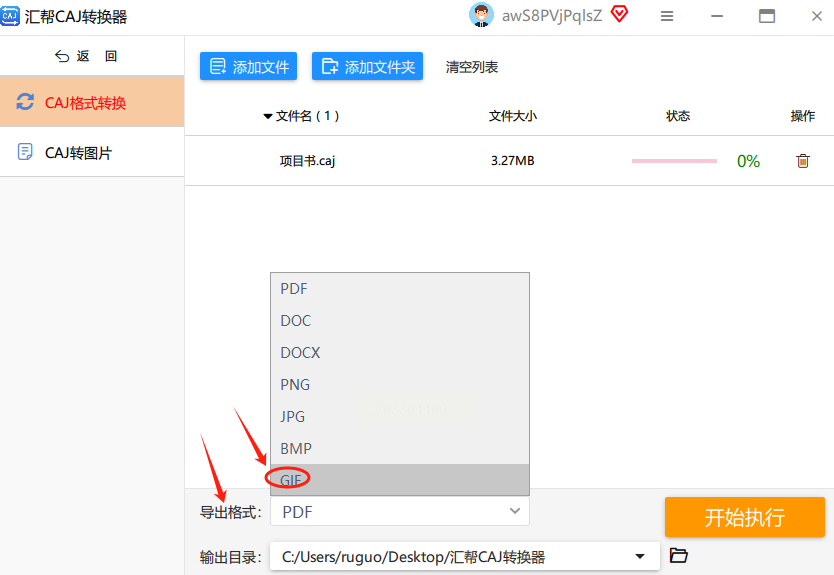 文件导进去之后,先别急着点开始。往下看,找到【导出格式】这个选项。点开下拉菜单,里面格式不少,有JPG、PNG、BMP等等。咱们这次的目标很明确,就选【GIF】。
