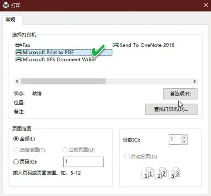 如果你不想安装额外工具,可以使用Windows系统自带的"Microsoft Print to PDF"虚拟打印机: