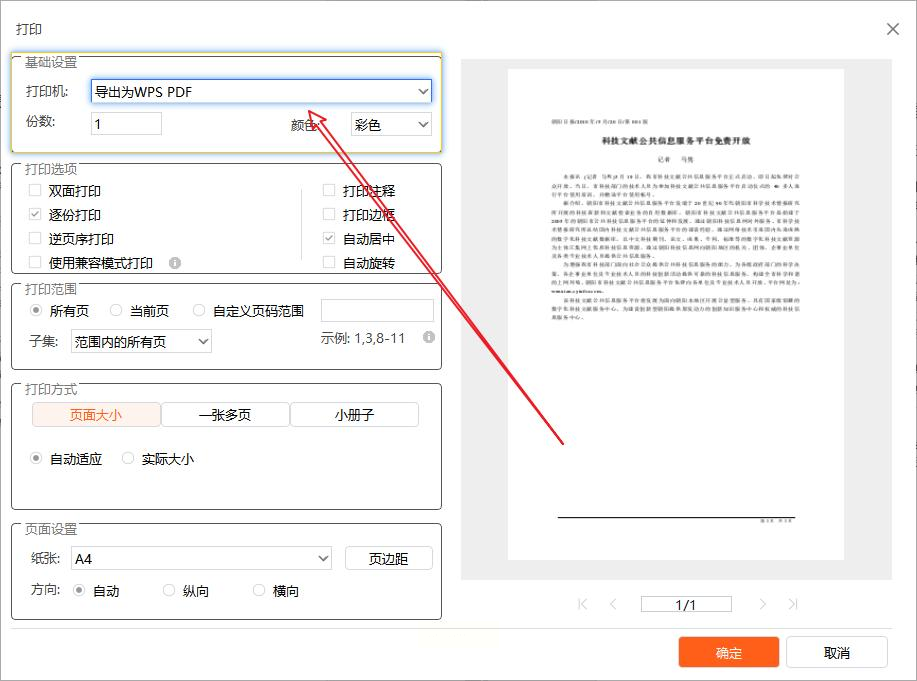 步骤三:在打印设置中,选择“导出为WPS PDF”。