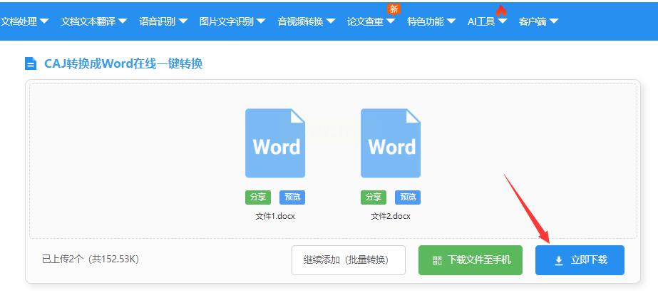 进入CAJ转Word功能页面后,点击上传按钮选择你要转换的文件。