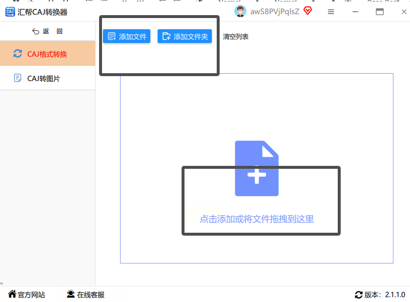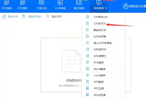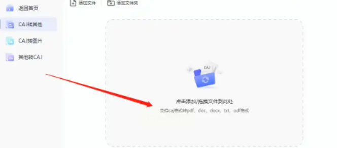 2. 进入主界面后,点击「CAJ格式转换」选项卡,右侧点击「上传文件」(支持拖拽多个CAJ文件到指定区域,或通过“添加文件”按钮分批导入)。