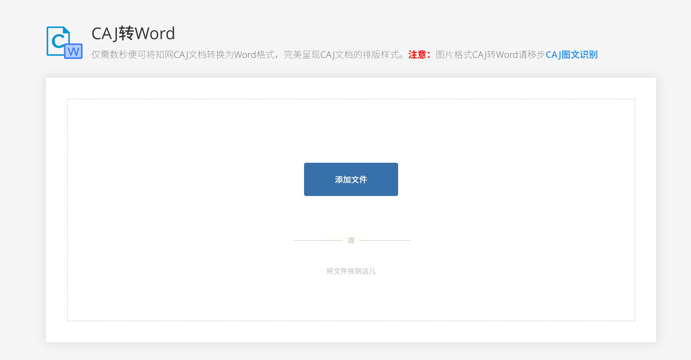 在主界面点击"CAJ格式转换"模块,点击界面中央的"添加文件"按钮,弹出文件选择窗口后,可通过文件夹导航定位CAJ文件。更便捷的方式是直接将文件从资源管理器拖拽到软件的"文件导入区",支持单次添加多个文件。