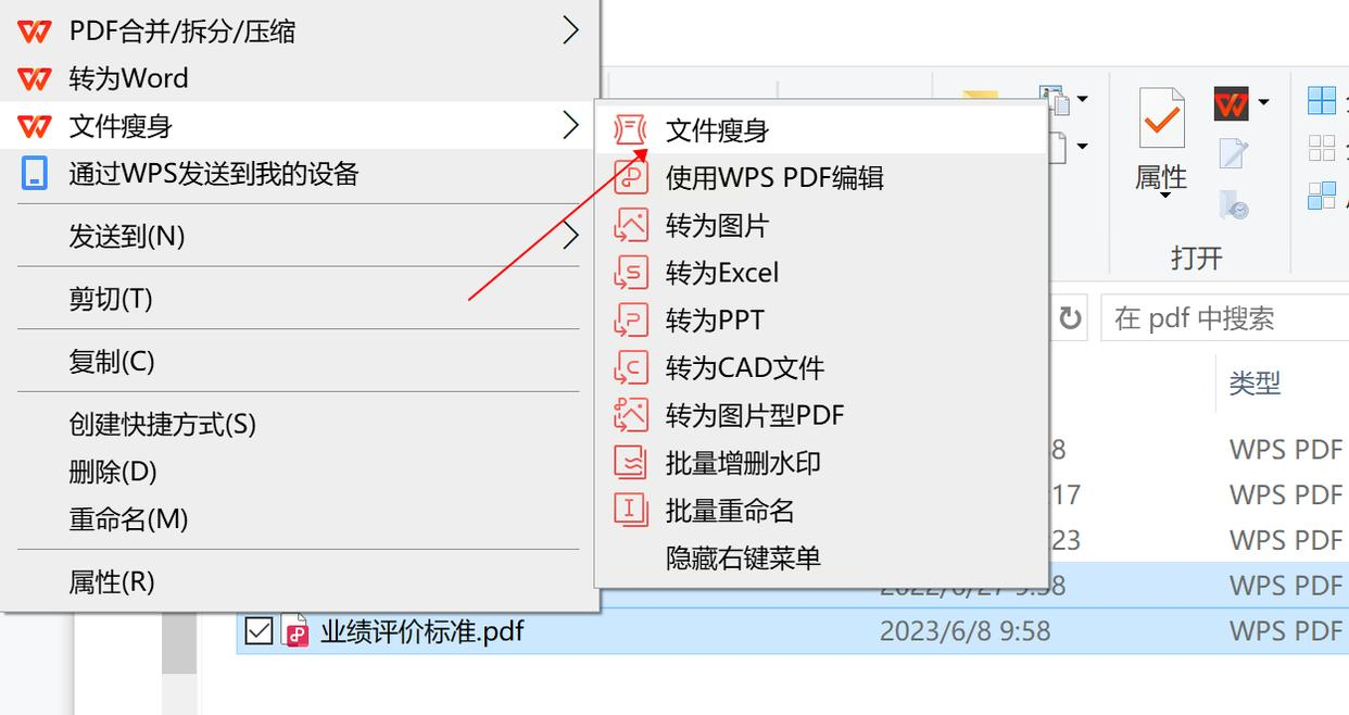 在弹出的菜单里,仔细找找,通常会有一个叫 【文件瘦身】 或者 【压缩PDF】 的选项(不同版本位置可能略有不同,多在“更多”或“分享”延伸菜单里),点击它。