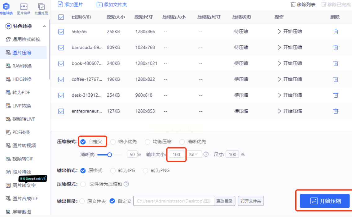 - 自定义:勾选后可手动输入“输出大小”(单位:KB),比如想压缩到100KB以内