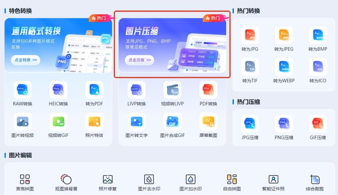 1. 打开软件后,在首页找到“图片压缩”模块(图标是个文件夹带压缩箭头的那个)。