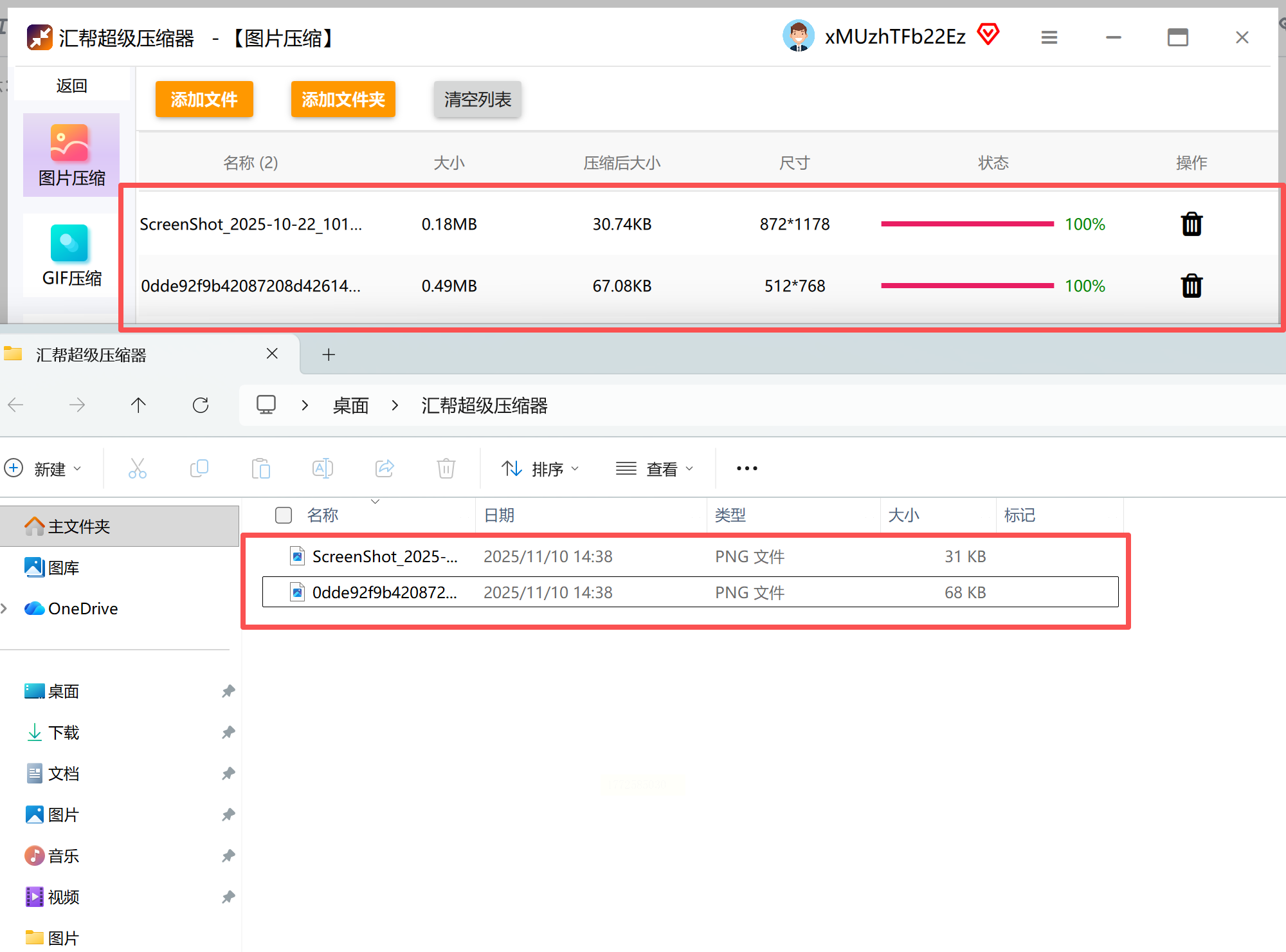5. 压缩完成后,软件会在左侧文件列表显示原始大小和压缩后大小的对比,点击“打开文件夹”就能找到处理好的文件。