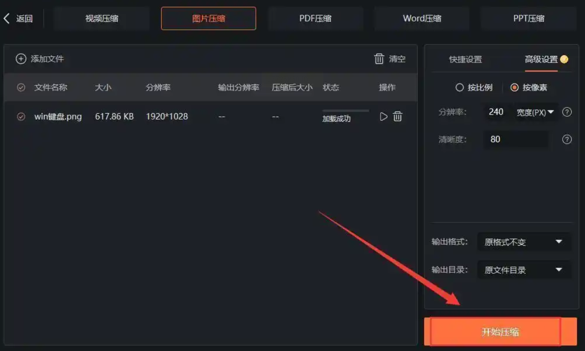 5. 点击“开始压缩”,完成后软件会显示详细的压缩报告,包括原始大小、压缩后大小、文件体积减少百分比。