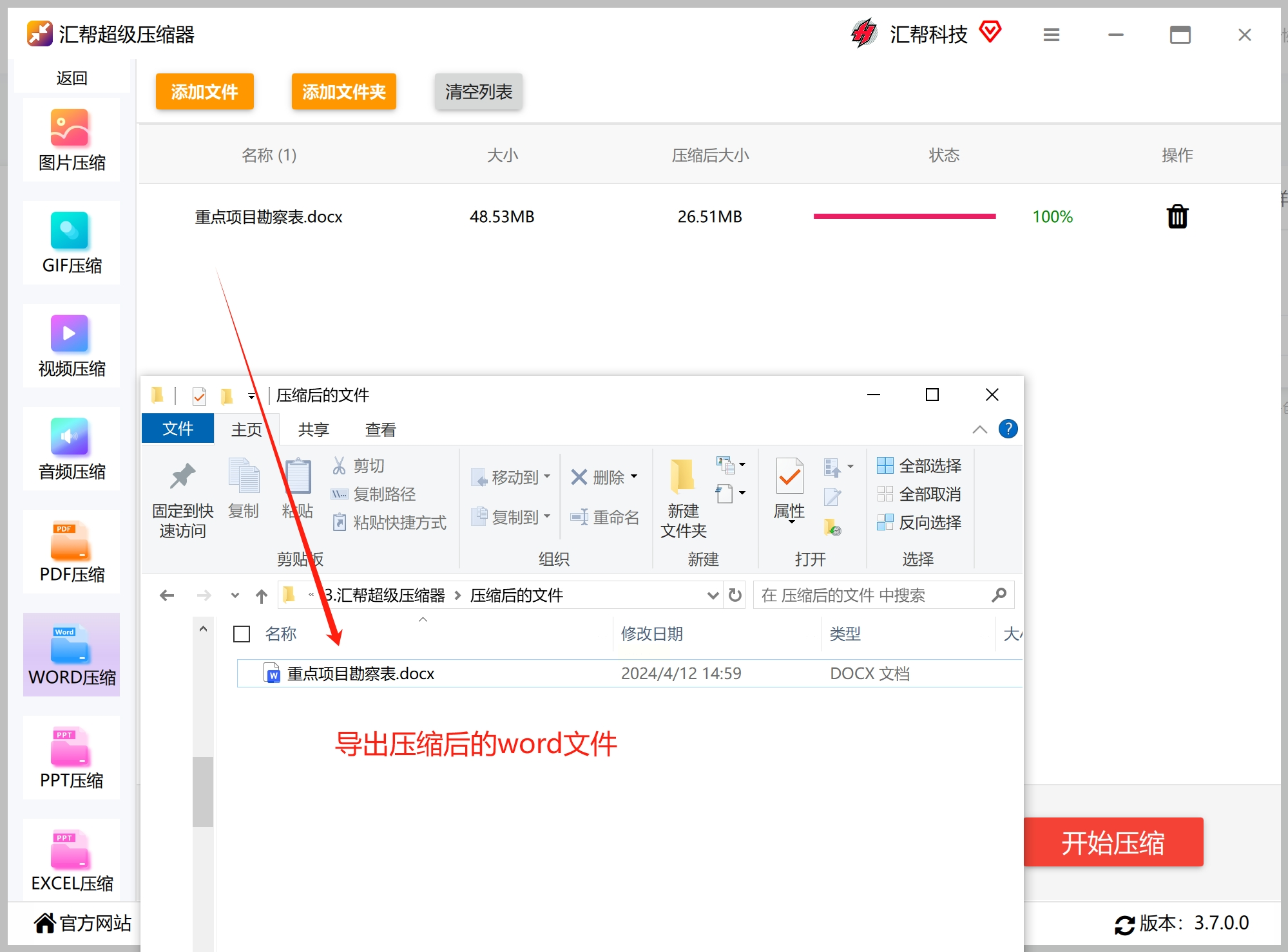 4. 开始压缩:点“开始压缩”,进度条走完就OK啦!压缩完会弹出提示,还能直接打开压缩后的文件检查效果~