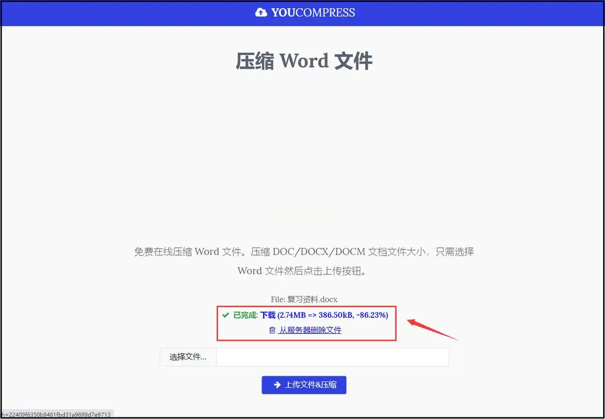 处理完成后,页面会显示压缩后的文件大小,点击“下载”按钮即可保存压缩后的Word文档。